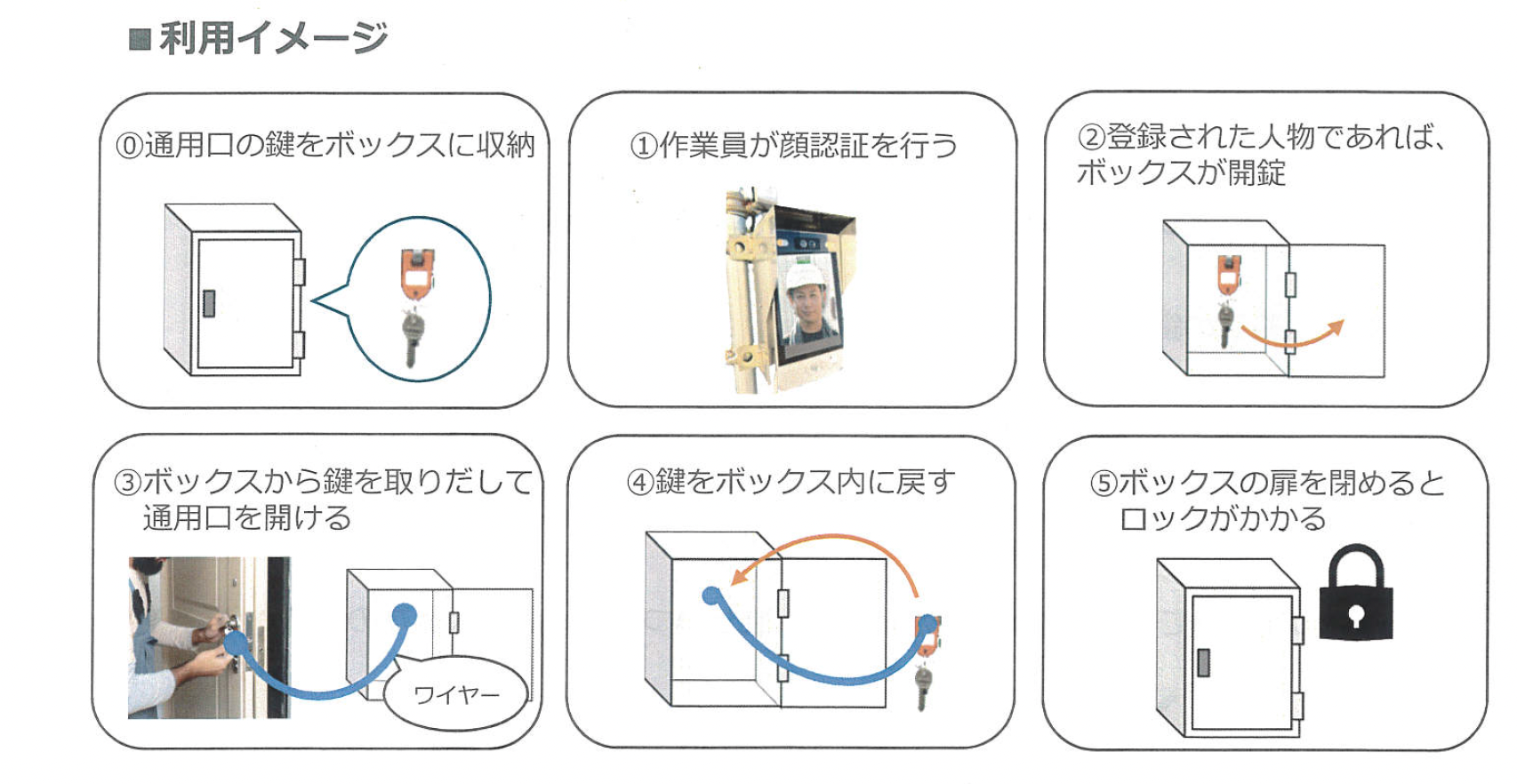 現場では通常、鍵の管理は現場事務所で行いますが、今回の現場では顔認証システム付きキーBOXを導入し、管理方法の効率化とセキュリティ向上を図りました。